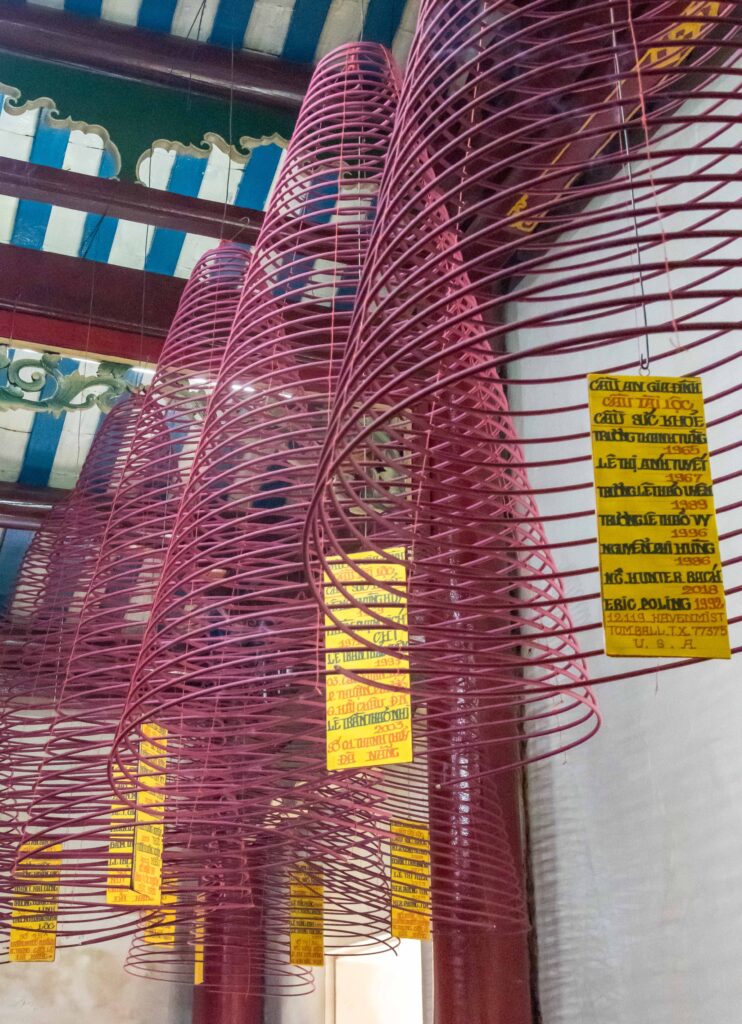 Normalerweise ist es Tradition, in den chinesischen buddhistischen Tempeln regelmäßig den Ahnen mittels Anzünden eines Räucherstäbchen zu huldigen. Aber, der Chinese – nicht dumm- , erfindet Räucherspiralen, welche bis zu 14 Tage durchgängig brennen. Also: Pagodenbesuch nur noch alle 14 Tage.