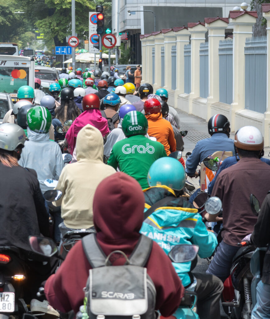 Der Verkehr in Saigon ist total verrückt. Vergesst alles, was ihr bisher in den Großstädten der Welt erlebt habt, das hier toppt alles. Es wird zum Horror für jeden Touristen, die Straße überqueren zu wollen. Ob Zebrastreifen oder grüne Ampel, völlig egal, bestimmt kommt ein Laster oder ein Bus und dann noch 20 Modeds dazwischen und noch einige in verkehrter Fahrtrichtung und damit nicht genug, sogar auf dem Fußweg wird man vom Moped angehupt, dass man zur Seite gehen soll. Dass dieses Verkehrsgebahren wirklich gefährlich für uns ist, äußert sich zum Beispiel daran, dass wir selbst Strecken von vielleicht 10 Minuten zu Fuß dann doch mit dem Bus gefahren werden(fürs Reisebüro wohl zu hohe potentielle Nachfolgekosten?).