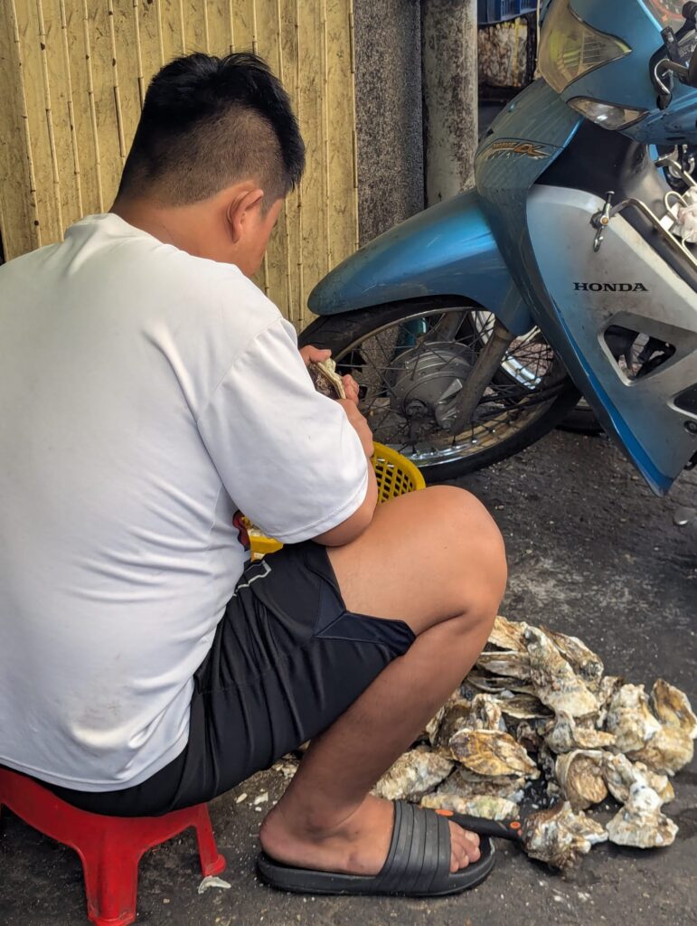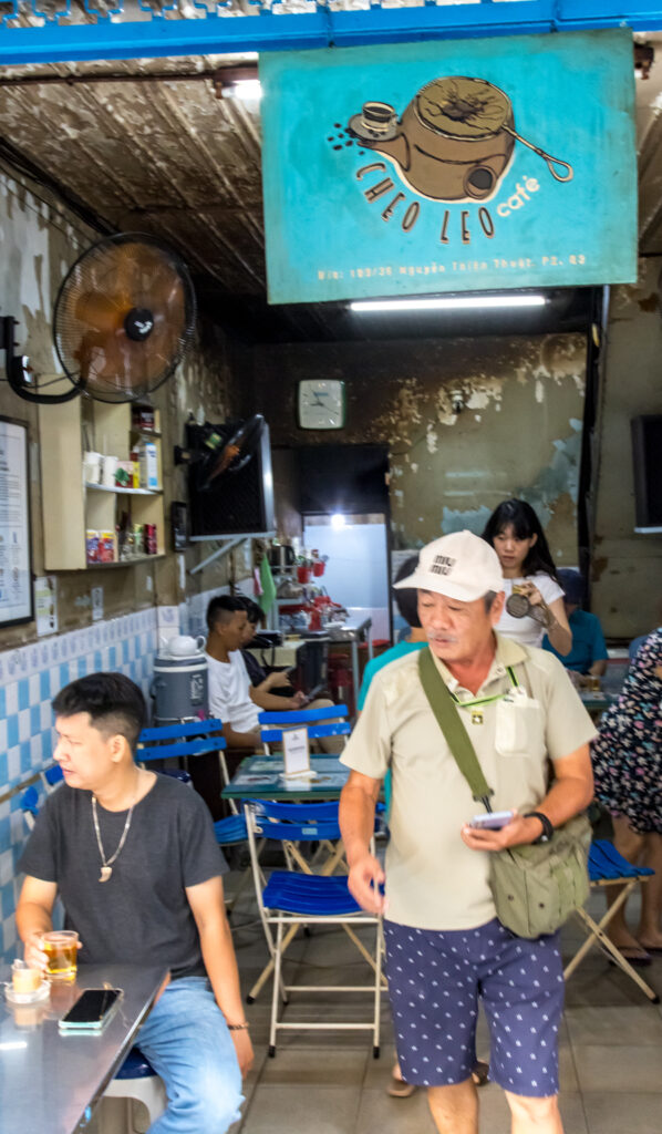 Unser neuer Gästeführer für Saigon und das Mekongdelta heißt Quook (glaube ich jedenfalls). Ebenfalls auch ein ehemaliger Gastarbeiter in der DDR. Er ist nicht direkt ein Sympathiebolzen, aber er hat es drauf, uns die versteckten authentischen Plätze dieser Riesenstadt mit 9 Millionen Einwohnern zu zeigen, die wir auf eigene Faust so nicht gefunden hätten oder uns nicht hingewagt hätten. Heute Morgen auf der Stadterkundungstour zu Fuß legten wir einen Stopp in einem Café ein, wie man es sich wohl kaum authentischer vorstellen kann. Das Cheo Leo Café gibt es seit 1938 und wird seitdem im Familienbesitz geführt und hat sogar eine eigene Webpräsenz. Man bat uns sogar in die Küche, um bei der Zubereitung des wirklich extrem leckeren vietnamesischen Kaffees zuzuschauen.