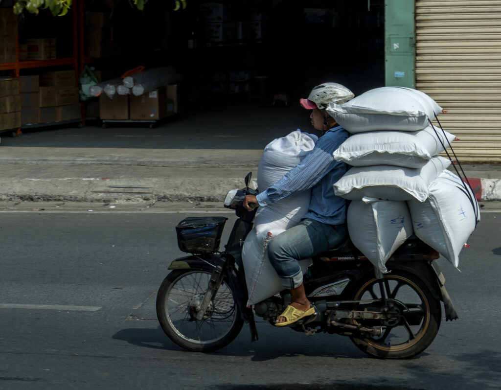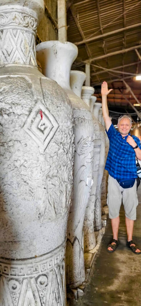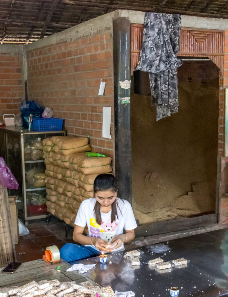 Die Nacht war kurz, aber trotz des harten Bettes erholsam. Vor uns lag die Abreise von der schönen Insel und vier Stunden mit dem Bus in die Richtung Kombodscha. Auf dem Plan stand heute noch der Besuch einer Schauwerkstatt für regionale Spezialitäten und einer Ziegelei. Bei den regionalen Spezialitäten gabs zum Beispiel Popreis oder Kokosbonbons. Interessant in welcher kurzen Zeit man von Hand Bonbons in Reispapier einwickeln und die Enden umfallten kann oder man Verpackungen von Reiswaffeln nur mit einer Kerze „verschweißen“ kann.
