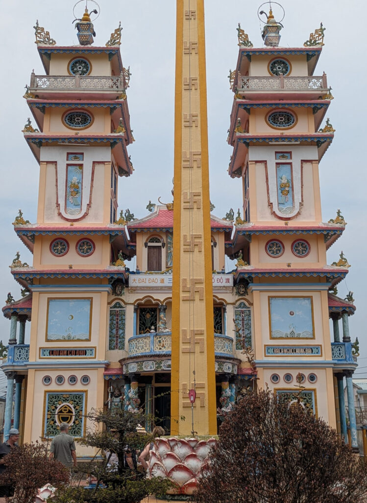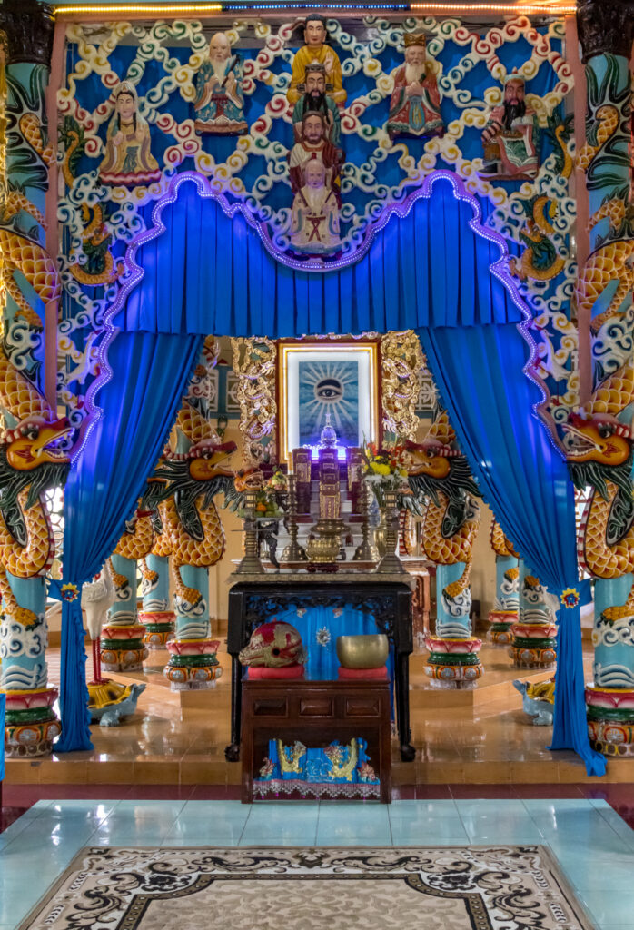 Nach Saigon sollte es wieder etwas ruhiger und ländlicher werden. Nächstes Ziel ist das Mekong-Delta. Dazu sind wir einige Stunden mit dem Bus gefahren. Unterwegs besichtigten wir einen Tempel einer Sekte (so jedenfalls die Auskunft unseres Reiseleiters), den Cao Dai Tempel in der Stadt Cai Be. Diese Religion hat nur einen Gott, aber bedient sich vieler Elemente aus allen möglichen Religionen. Über allem wacht das linke Auge Gottes.