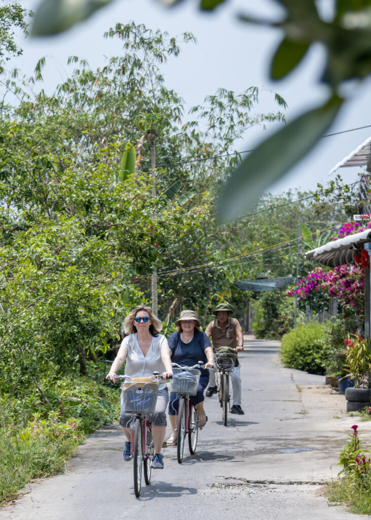 Weiter ging es mit Fahrrädern, durch ein malerisches Dorf im Mekongdelta: Cai Be. So ein bißchen wie der Spreewald auf vietnamesisch: viele kleine Flussarme, dazwischen Leute auf kleinen Kähnen, hier ein kleiner Obstgarten, dort ein schöner Blumenhain … und gar nicht so in den Ecken zugemüllt, wie wir es in den letzten Tagen leider schon oft gesehen haben. Man muss der Ehrlichkeit halber dazu sagen, dass der Mekong jedes Jahr mindestens ein Hochwasser mit sich bringt. Und dabei wird natürlich alles mögliche angeschwemmt … und eben nicht gleich weggeräumt, deshalb gibt es Ecken, in denen sich nun der Unrat sammelt. Diese Theorie kann man aber nicht auf die Städte anwenden, dort sieht es an den Straßen- und Fußwegrändern ziemlich zugemüllt aus, und das hat dort nix mit Hochwasser zu tun. Es gibt eine staatliche Müllabfuhr und in einigen Städten haben wir auch die zusammengetragenen Haufen gesehen, die darauf warteten, abgeholt zu werden. Sogar öffentliche Mülltrennungseimer haben wir, wenn auch selten gesehen. Aber irgendwie scheint es die Leute selbst nicht so zu stören. Man muss zum Thema noch sagen, dass der von uns in Europa produzierte Müll, den wir, nachdem dienstags das Müllauto da war, nicht mehr vor Augen haben, ja nicht über Nacht von Zauberhand verschwindet, sondern ja auch irgendwie zwar durch Mülltrennung minimiert, aber letztendlich ja auch in andere Länder exportiert wird. Also eigentlich unser aller, ein globales Problem. Hier in Vietnam scheint es aber im Individuellen eher eine Typfrage zu sein. In einem Haus einer vietnamesischen Familie sieht es auf dem Boden sauber und geleckt aus und schon im Nachbarhaus liegt nur Zeug rum, so Dinge, wo nicht mehr klar ist, ob sie noch gebraucht werden oder nicht, es stapeln sich die teilweise kaputten Mopeds im Hof, …