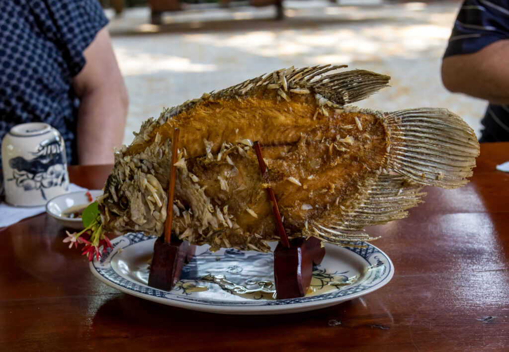 Bei unserer Ankunft war bereits ein Mittagessen aus selbst erzeugten Produkten vorbereitet. So wurde uns ein gebratener Elefantenohrfisch publikumswirksam serviert, und natürlich Obst aus dem Garten.