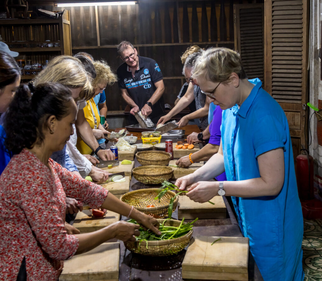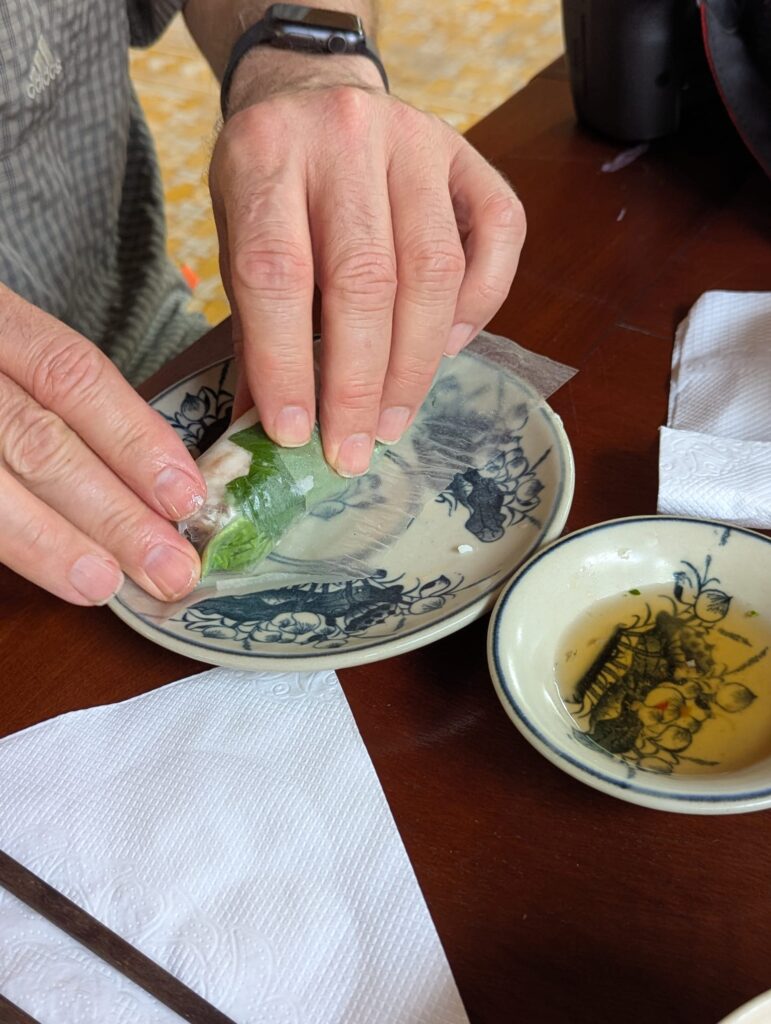Am Abend hielt die Gastgeberin für uns einen Kochkurs bereit, scheint hier jeder Reiseleiter gerne in sein Programm aufzunehmen. Ist lustig, man kommt mit Einheimischen in Kontakt (von „ins Gespräch kommen“ würde ich jetzt nicht reden, denn mit Englisch kommen wir oft nicht sehr weit. Aber mit Händen und Füßen geht vieles, wenn nur beide Seiten wollen) und geschmeckt hat es am Ende auch. Inzwischen sind wir perfekt im Wickeln von Frühlingsrollen aus Reispapier.