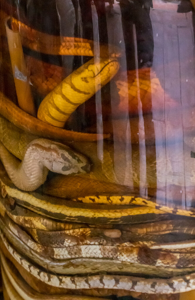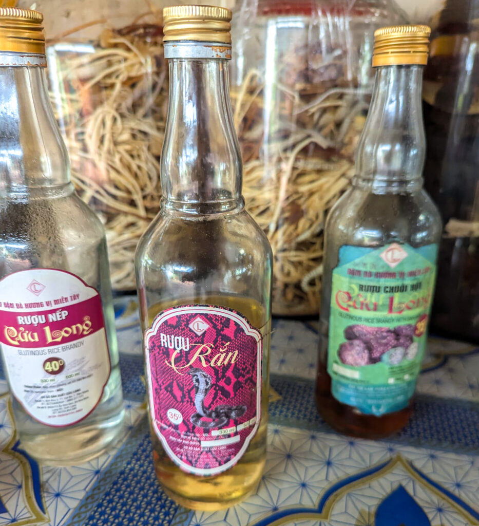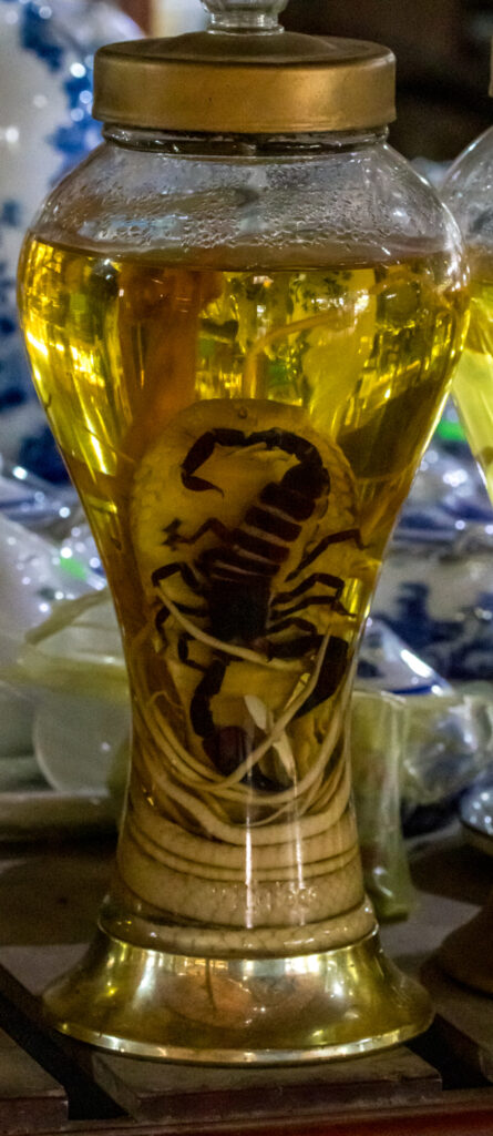 Schlangen wurden hier nicht nur für den Reisschnaps gehalten, sondern im Laden nebenan gabs auch Gürtel und Portmonees aus Schlangenleder. Den Zoll würde es freuen, vom Naturschutz mal abgesehen.