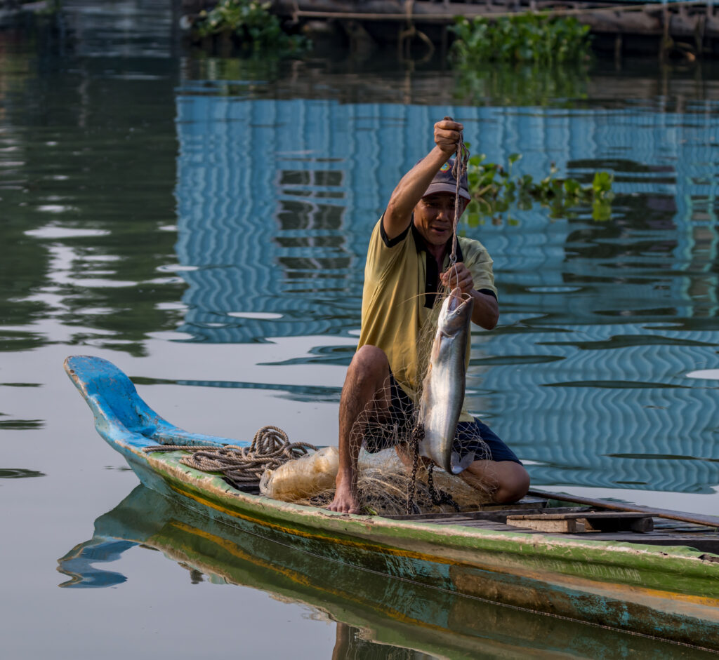 Am Nachmittag wurde es sehr wieder mal sehr authentisch. Wir besuchten ein schwimmendes Fischerdorf am Bassac River, einem Seitenarm des Mekong. Es gibt zahlreiche dieser schwimmenden Fischfarmen und schwimmenden Häuser, in denen die Bewohner in Netzen und Drahtkörben Fisch und Süßwassergarnelen züchten, ein wichtiges Exportprodukt der Region. Im Mekongdelta wird jede Menge Fisch gezüchtet. Nicht wild gefangen, sondern unter den Stelzenhäuser am Ufer in Netzen gezüchtet. Wir haben eines dieser Fischerhäuser besichtigt. Eine sehr traditionelle Arbeit hier in der Region, aber teilweise unter prekären Verhältnissen.