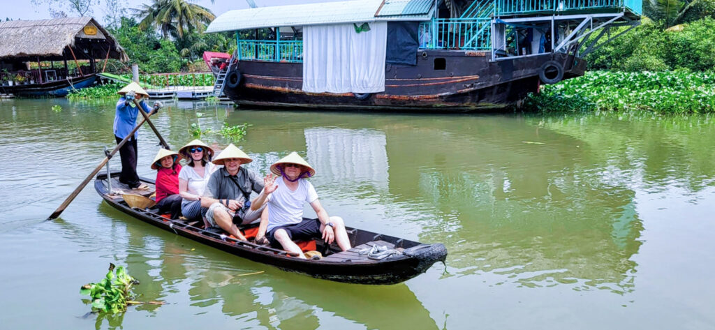 Nächster Stopp: Früchteverkostung in Cai Be, bevor wir mit samt unseren Koffern die große Insel An Bình zwischen mehreren Mekong-Armen ansteuerten. Zuvor stiegen wir für eine Erkundung des Deltas noch in kleinere Ruderboote um und wurden gerudert und mit „richtigen“ Sonnenhüten ausgestattet.