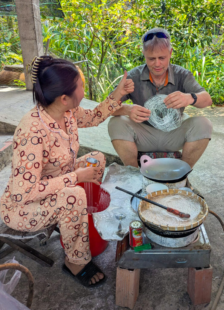 Zurück zur Radtour durch den vietnamesischen Spreewald. Wir machten Halt an verschiedenen kleinen Werkstätten, vielmehr kleine Home-Produktionsstätten, z.B. für Reispapier oder für Hängematten aus getrockneten Bananenstaudenstilen.
