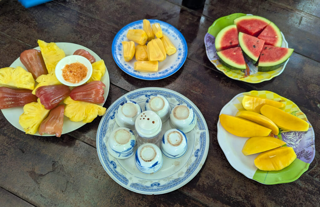 Zu verkosten gab es dieses Mal: Mango, Ananas, Wasserapfel, Papaya, Guave, Jackfruit, Augenfrucht (eine der Litschi ähnliche Frucht).