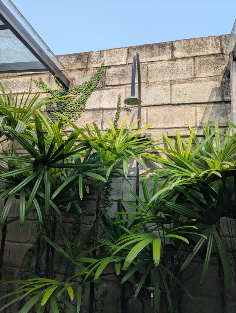 Als Quartier gabs eine von der Vitnamesin Ut Trinh geführte private Lodge. Bei uns würde man sagen „Urlaub auf dem Bauernhof“. Eine kleine Farm mit Obstbäumen, Fischzucht und Hühnern. Die Zimmer waren besonders und exotisch. Das Bad war auf der anliegenden Terrasse untergebracht unter freiem Himmel. Nur über der Toilette gabs eine Plexiglasscheibe als Dach, damit man sich nicht den Kopf verbrennt, falls es mal wieder länger dauert. Sehr urig, direkt unter einer Palme zu duschen. Den flexiblen Duschkopf hatte ich unter dem Palmwedel zunächst gar nicht gefunden.
