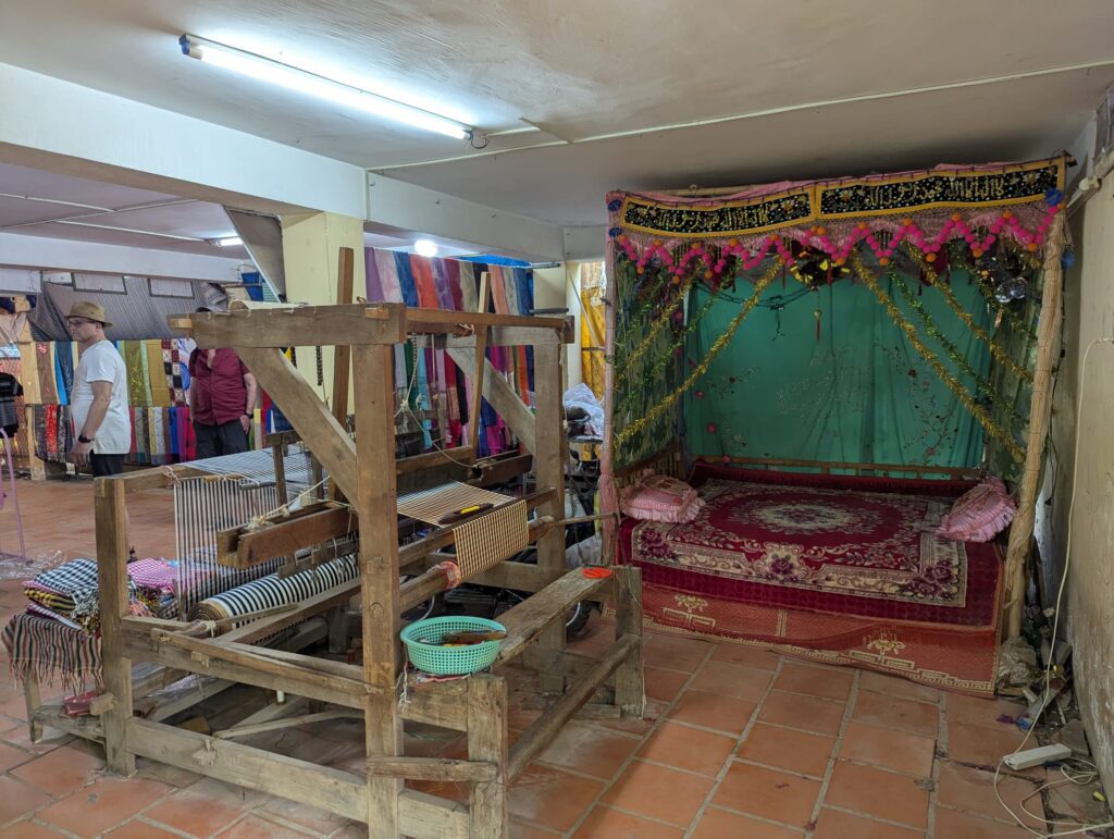 Anschließend besuchten wir ein ethnisches Cham-Islam-Dorf, eine vietnamesische Minderheit, die wir schon im Norden in den Bergen besucht hatten, diesmal aber mit der islamischer Religion. Was sofort auffiel, die sonst so freundlichen und uns gegenüber sehr aufgeschlossenen Menschen waren das hier nicht. Erstmal rannten uns die Kinder hinterher und bettelten, so wie ich es aus Ägypten kannte, unangenehm. Wir zwängten uns auf schmalen Stiegen durch das Stelzenhausdorf bis zu einer kleinen Weberei.