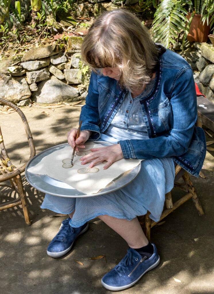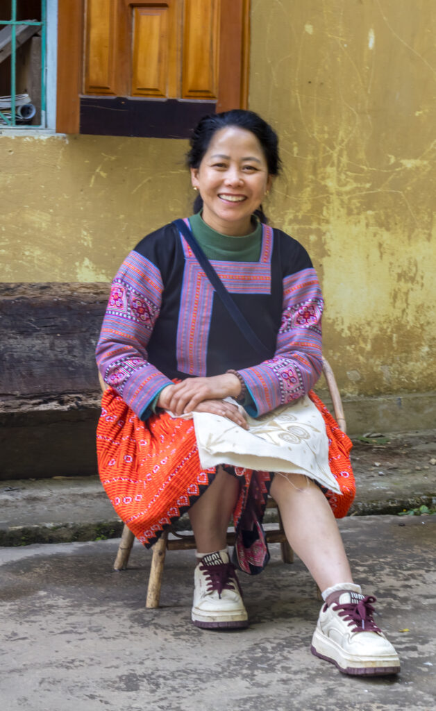 Zum Glück hat wenigstens das Mücken-Gesumme im Bungalow Dank der Tötungsdelikte meines mitreisenden Ehegatten aufgehört. Aber laut unseres Reiseleiters gibt’s ja um diese Zeit keine Mücken in Vietnam. Wahrscheinlich bildet sich meine Wade die juckende, insektenbedingte Schwellung nur ein. Nun aber genug meiner nächtlichen Befindlichkeiten. Wir hatten heute einen sehr schönen Tag und ich konnte die Vorteile einer geführten Reise erstmals spüren. Niemals hätten wir als gewohnte Urlaubs-Selbstorganisatoren einen Batiknachmittag bei den Schwarzen Hmong buchen können(allerdings würde uns auch das wirklich gewöhnungsbedürftige, grenzwertige und hochstapelnde Gerede unseres Reiseleiters erspart bleiben). Entgegen den Ankündigungen unseres Reiseleiters Châu war die Batik-Kursleiterin aufgrund ihrer Zugehörigkeit zum Bergvolk der Schwarzen Hmong nicht etwa von unreiner Haut und unseren Einschätzungen nach auch nicht weniger intelligent, sondern eine überaus nette, zuvorkommende und hübsche Person, die uns die Technik des traditionellen Wachsbatikens und Indigofärbens näher brachte. Meiner Meinung nach bemisst sich Intelligenz durchaus im Denken über und im Umgang mit Minderheiten. Aber wie bringt man dies einem stark von sich überzeugen Reiseleiter nahe … ?