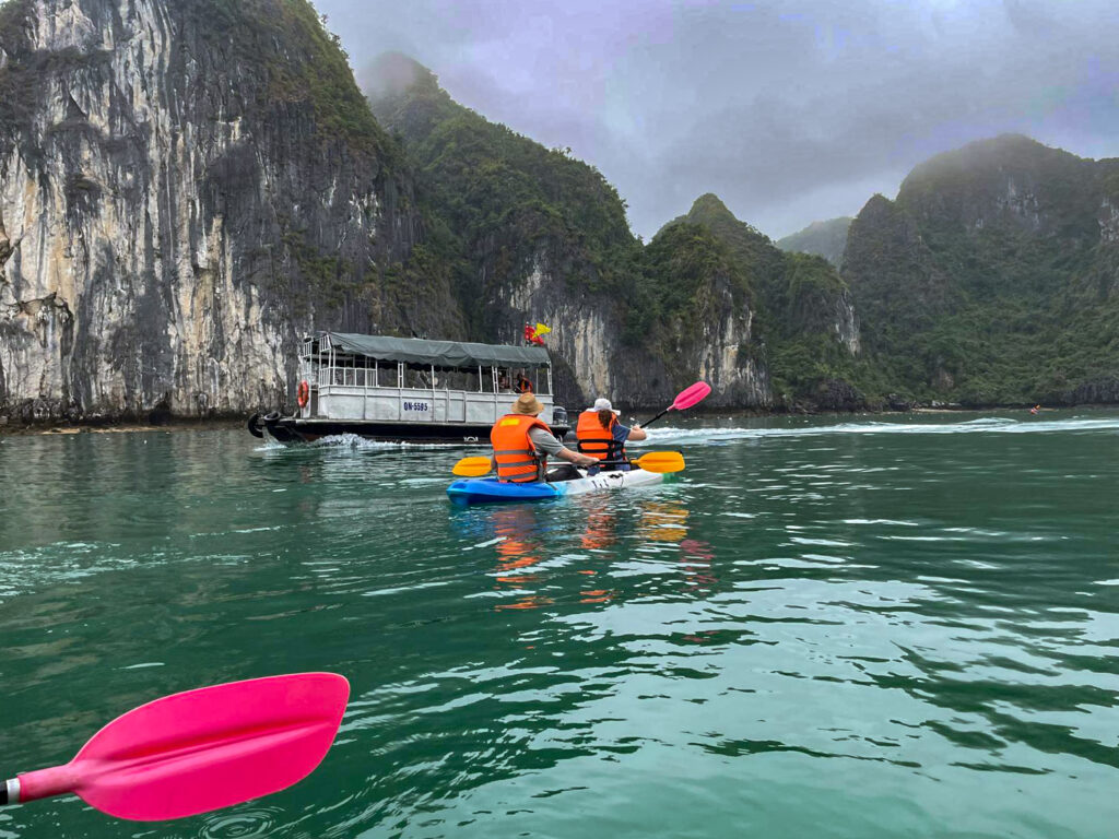 Leider schwemmte es in der uns zum Kajakfahren zugewiesenen Bucht allerlei Unrat an. Plastiktüten, Bananenschalen und Trinkflaschen waberten durch das so schöne leicht türkisfarbene Wasser. Wir hatten ja schon im Vorfeld gehört, dass es bei ungünstigen Wetterverhältnissen in der Halonen-Bucht zu Dreckproblemen kommen könne. Unser Reiseführer meinte, dass dies erst seit einigen Tagen mit der Wetterlage zusammenhinge. Ich glaube das dies eher ein schon lange vorhandenes Problem ist. Das Müllproblem war uns schon auf dem Land und den Städten aufgefallen. Nur dass es sauberere Städte und Landstriche als andere gab. Zumindest auf den vielen kleinen privaten Reisfelder und Obst- und Gemüseplantagen war nicht ein Krümel Dreck zu sehen. Anderenorts wiederum sah man brennende Müllhalden neben der Autobahn. Speziell die Thematik des Unrats im Wasser in der Halong-Bucht haben wir ausführlich in unserer Reisegruppe diskutiert und sehen eigentlich mehrere Möglichkeiten, dieses Problem in den Griff zu kriegen. Außerdem hätte man uns beispielsweise nur eine Mülltüte und ein paar Handschuhe geben brauchen und wir hätten beim kajaken direkt bissel was eingesammelt. Bestimmt wäre andere Touristen auch dabei gewesen. Ursache dieses offensichtlich eher allgemeinen Müllproblems ist meiner Meinung nach der relativ unreglemetierte Tourismus im inzwischen eher kapitalistischen Vietnam, in dem es eher um Profit und Gewinn als Erhaltung der Ressource Natur geht. Schade, wie die Vietnamesen ihr UNESCO-Kulturerbe aufs Spiel setzen. Tourismus und Naturschutz müssen sich nicht zwangsläufig ausschließen.