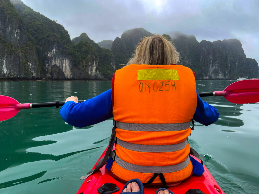 Angekommen am Terminal zu den Bootsausflügen in der Halong-Bucht wurden wir mit einem Ingwertee begrüßt. Hilft Ingwer nicht gegen Übelkeit? Der nun folgende Tag war randvoll mit möglichen Ausflügen und Aktionen und kulinarischen Höhepunkten. Das Team um die Managerin Tea (sie hat ihren Namen für uns als Tea abgekürzt) und die Gästeführerin Monica (sie hieß wirklich so, jedenfalls stand das auf ihrem Namensschild) hat sich extrem viel Mühe gegeben. Beim Betreten des Schiffes wurden wir mit Rosenblättern beregnet (und nochmals mit einem warmen Ingwer-Shot begrüßt). Es lag ein Hauch von Luxus in der Luft. Das Schiff war schon etwas in die Jahre gekommen, aber sehr sauber mit schwarzem Teakholz und hatte einen gewissen „Southern-Comfort-Charme“ (wer den Whisky-Werbespot aus den 90-ern noch kennt).