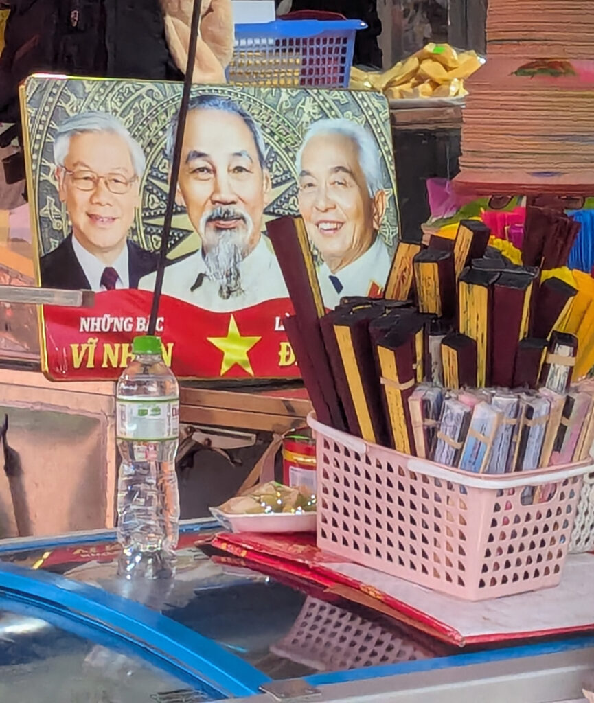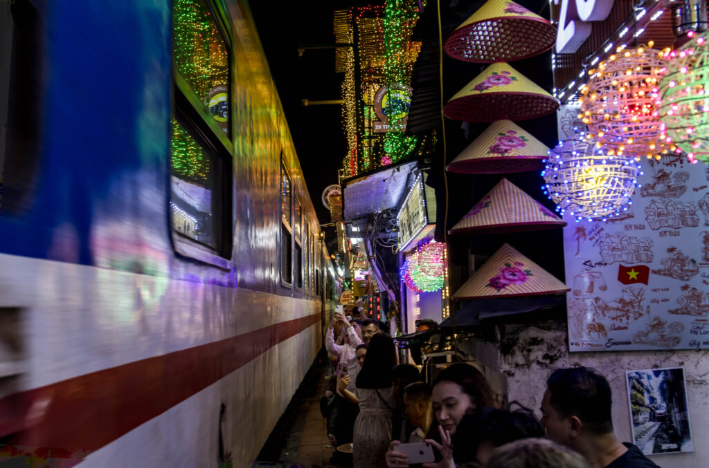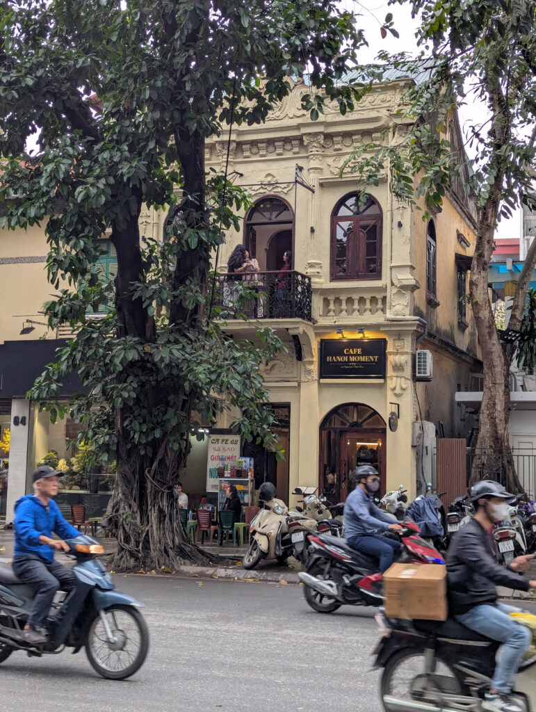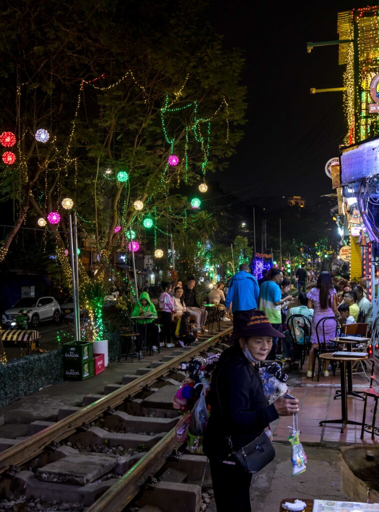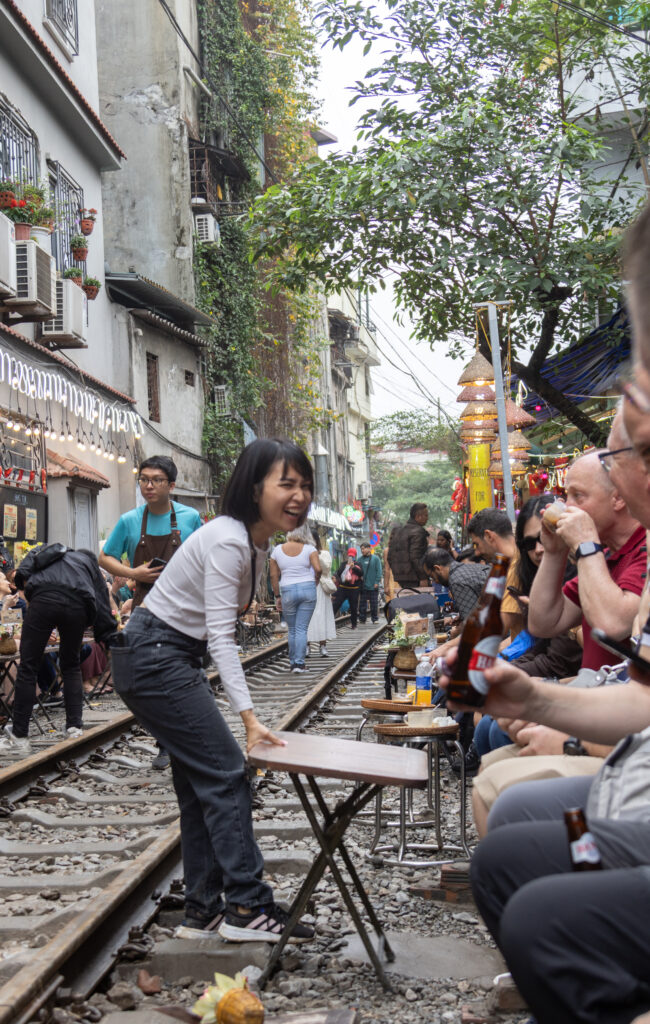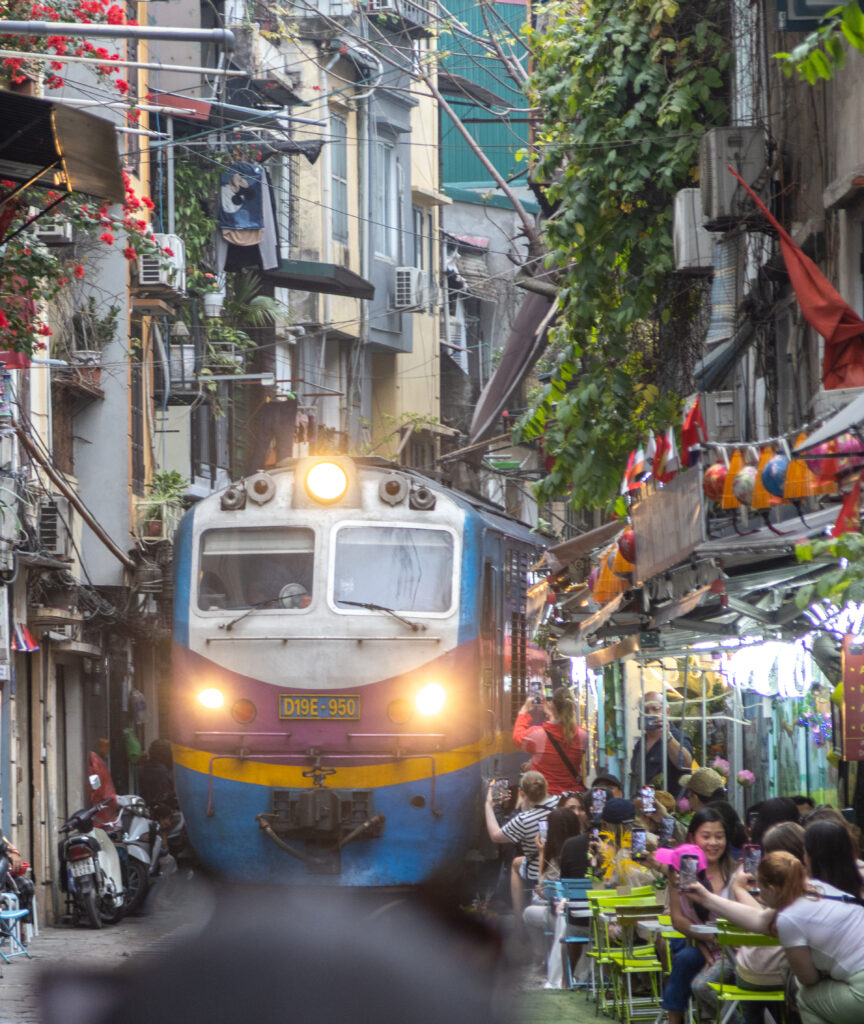 Der Tag hielt noch den Besuch des Literaturtempels und des HoChiMinh-Komplexes für uns bereit. Aber eigentlich wollten wir den nicht auf dem Programm stehenden Train-Market besuchen. Der Zug fährt mitten durch die Stadt. Rechts und links der Schienen haben sich Marktstände und Cafés direkt bis an die Schienen angesiedelt. Die Verkaufsstände und Cafétische werden nur kurz vor Zugeinfahrt zur Seite geräumt. Das hat sich inzwischen zum Spektakel und Touristenmagneten entwickelt. Unseren Reiseführer Châu mussten wir zwar etwas überreden, aber er hat uns in ein nettes Café direkt an der Schiene mit prima Eier-Kaffee geführt. Eier-Kaffee (Egg Coffee) ist eine vietnamesische Spezialität des leicht nach Kakao schmeckenden, in Vietnam geernteten Arabica-Kaffees mit aufgeschlagenem Eigelb. Klingt erstmal komisch, schmeckt extrem lecker, nehmen wir in unsere weitere to-do-Liste für die nächsten zwei Wochen auf. Das Spektakel an der Bahnschiene nahm seinen Lauf, als die Café-Chefin irgendwann zu uns kam und die Tisch zusammenklappte und mit uns rumalberte, ob wir unser Testament gemacht hätten, wenn wir an den Gleisen sitzenblieben. Mir war der Rummel nicht so recht geheuer und ich hatte mir einen schnellen Abgang gesichert.