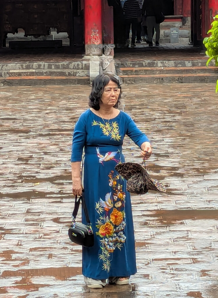 Noch ein kleiner Beitrag aus der Rubrik „Klugschei…-Wissen“: in Tempeln werden Menschen verehrt, die tatsächlich gelebt haben und nur in Pagoden werden Gottheiten verehrt. … und ich hab mich noch gewundert, wieso es einen Ho Chi Minh-Tempel gibt, jetzt weiß ich es. Der Literaturtempel war die erste Universität und auch Schule für Kinder in Hanoi gewesen, man hat sich wohl in früheren Zeiten eher der Kunst und Literatur gewidmet, Naturwissenschaften gab’s wohl erst später. Auf alle Fälle war laut der Lehre von Konfuzius der Eingang zu diesem Tempel den Frauen zunächst verwehrt. Dies hatten die alten Vietnamesen durch hohe Eingangsstufen versucht zu regeln, welche die Frauen aufgrund ihrer Röcke nicht passieren konnten. Daraufhin haben die Frauen ihren Kleidungsstil angepasst und tragen seitdem die auch heute noch vorbereitete Kombi aus Hosen mit seitlich geschlitzten Kleid darüber und haben sich Zugang zu den Tempeln verschafft.