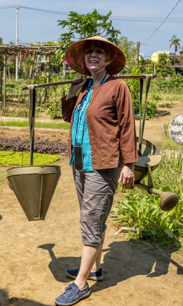 Am Nachmittag hatte Chanh für uns einen Kochkurs auf einer Biofarm organisiert. Dazu ging per Drahtesel (natürlich wieder Möhren 🥕 ohne Bremse, geht ja schließlich auf einen landwirtschaftlichen Hof) durch die ländliche Gegend, vorbei an Reisfeldern, ein Wasserbüffel rechts, ein Kuhreiher links, …. fast schon kitschig idyllisch.