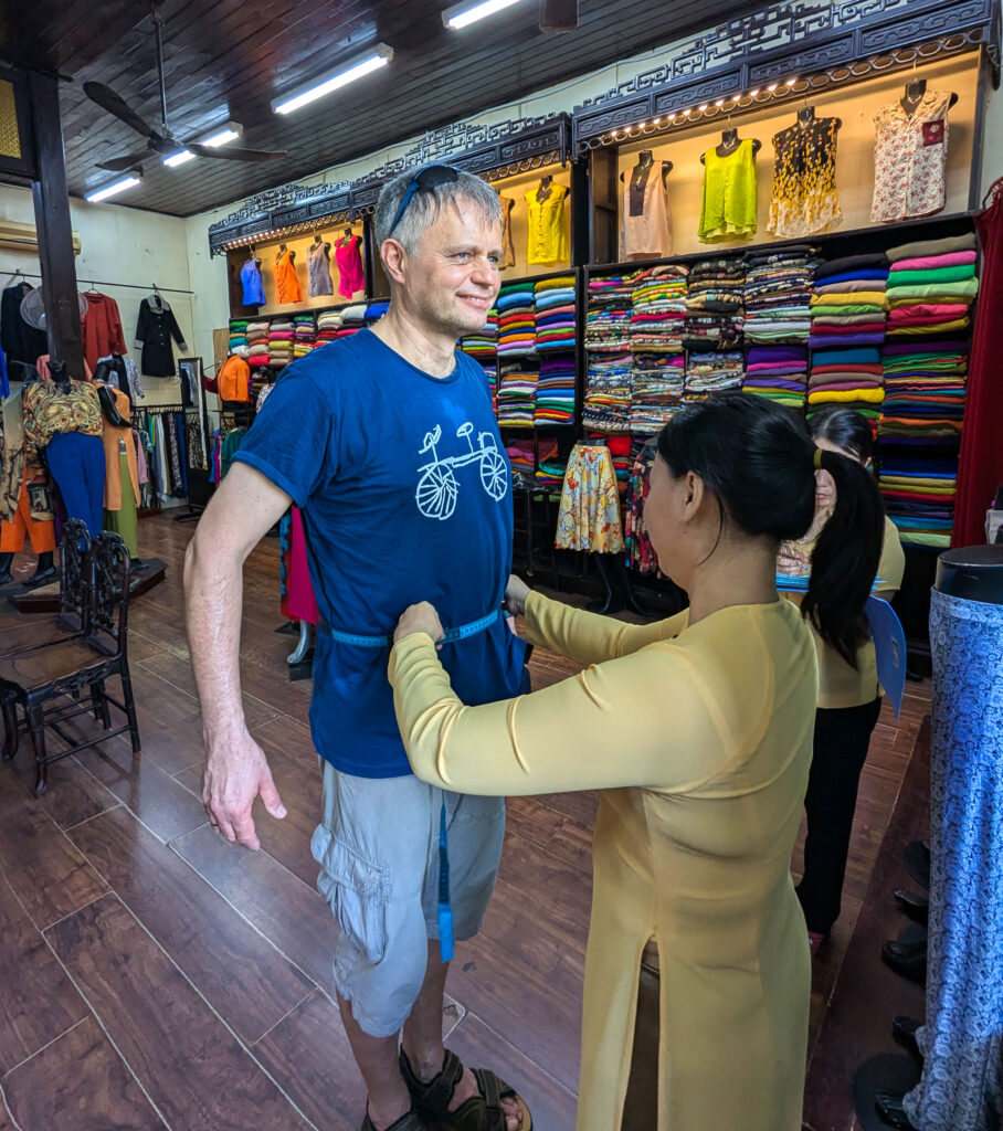 … und anschließend ein Besuch einer Seiden-Manufaktur mit Schneiderei. Hoi An wird auch die Stadt der Schneider genannt. Man kann sich binnen einen Tages einen Anzug maßschneidern lassen. Bei uns war es nuuuuur ein Hemd und ein Kleid.